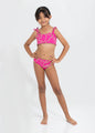 El Alegría es el favorito para las niñas que aman combinar diversión y color. Con su print abstracto en fucsia con verde lima por un lado y su efecto tie-dye pastel por el otro, este vestido de baño reversible ofrece dos looks diferentes en una sola prenda.